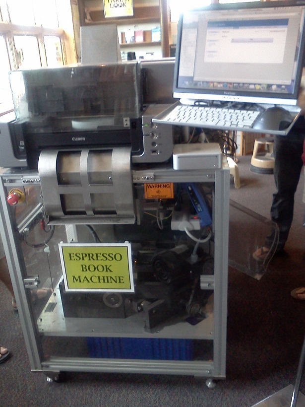 I’m guessing most of you reading this have heard of the Espresso Machine. Simply put, it’s an ATM for books. You select the manuscript you want and the machine prints it up for you right there on the spot.