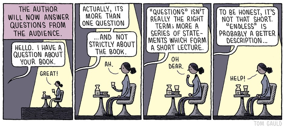 Another way to consider this is that 80% of the audience is not here to listen to me. If they want to hear from Kristi or Craig or Sarah (to use our previous examples), they’re going to be seriously annoyed if I try to dominate every question the moderator throws out. And people who are annoyed at me rarely want to buy my books… at least, in my simple understanding of human psychology.