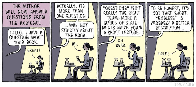 I’ve seen this from both sides. I’ve been on panels where somebody always had to speak first, kept leaping in, kept talking over people. I’ve been out in the audience when one panelist cut into every response to make their observation or their funny comment. It’s not fun from either direction. It’s mildly amusing at first, but after a while you just want that person to shut up and let someone else talk for two minutes.