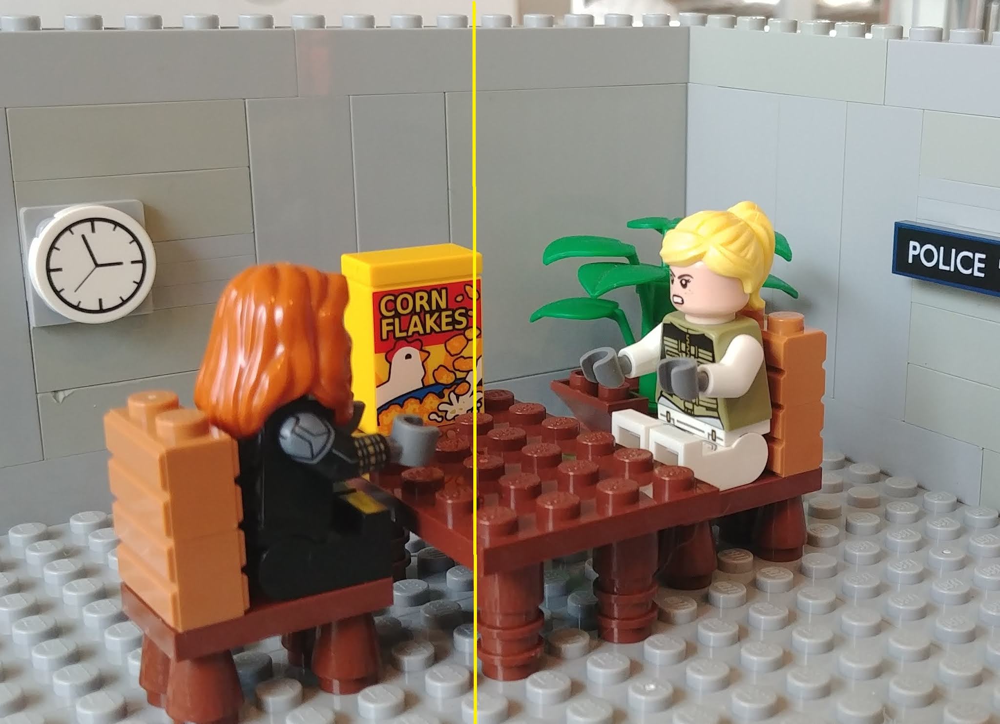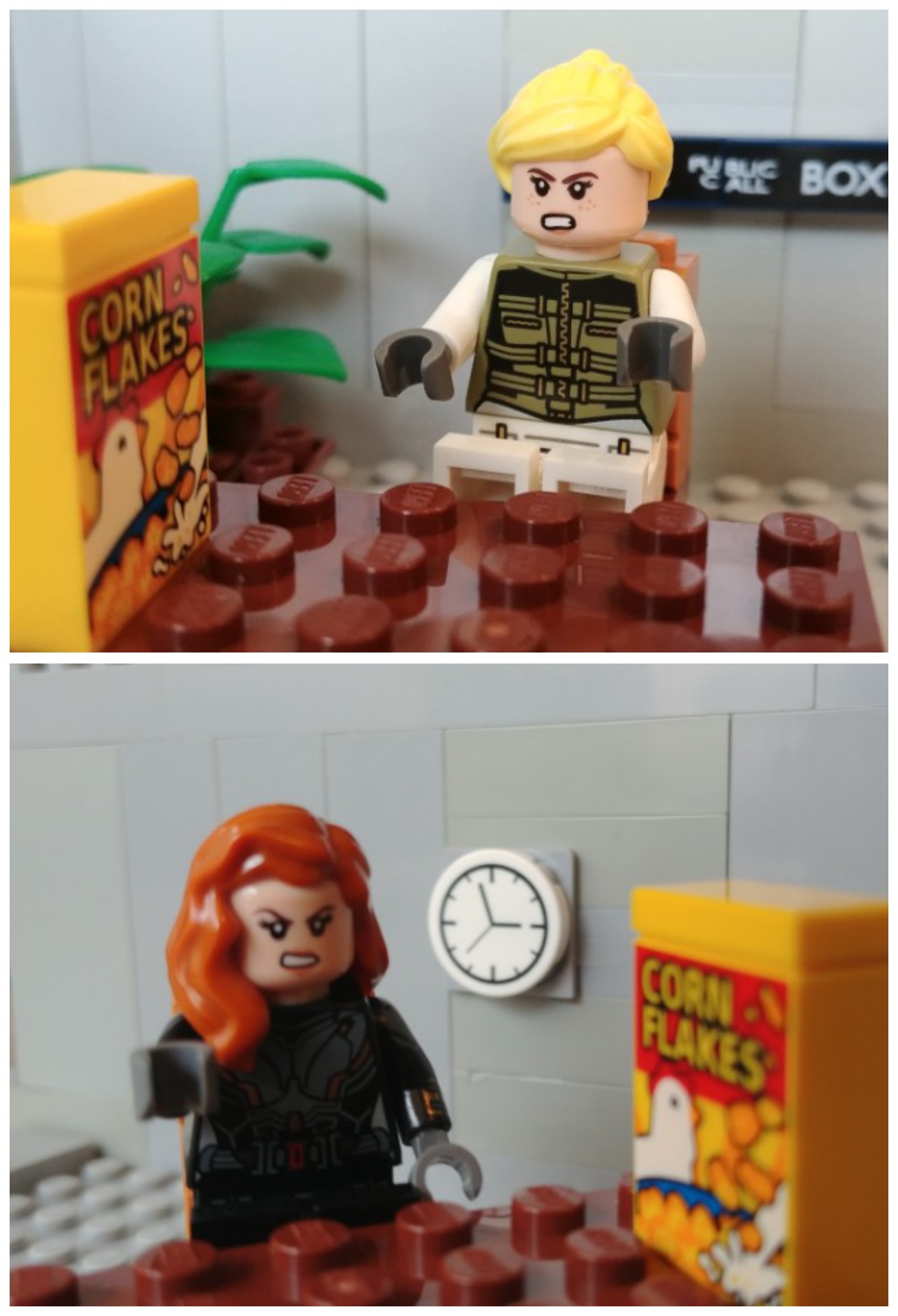 Now, there’s another aspect to this and it’s called crossing the line. Here’s how it usually gets explained. Natasha and Yelena are sitting at the kitchen table eating breakfast and the box of cereal’s on the table with them. When we shoot our master shot, these things are going to be on one side or the other—some people say it’s with her or with her For example, Yelena’s bowl of cereal would clearly be with her, Natasha’s bowl is with her. But the box… who’s the box with? Because if we try to shoot it with both of them, it’s going to jump back and forth on screen as it crosses the line. If the camera’s facing Yelena, it’ll be on the left, but if it’s facing Natasha now it’ll be on the right. Make sense? Look, I even included helpful visuals. Again, it’s going against that cinematic language. So we need to make a decision and stick with it (I’m saying the cereal is with Natasha).